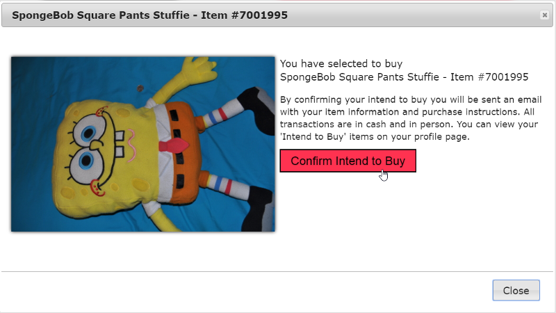 When you click this button a confirmation popup will appear with the item details and a confirmation 'Intend to Buy' button. As seen here.
